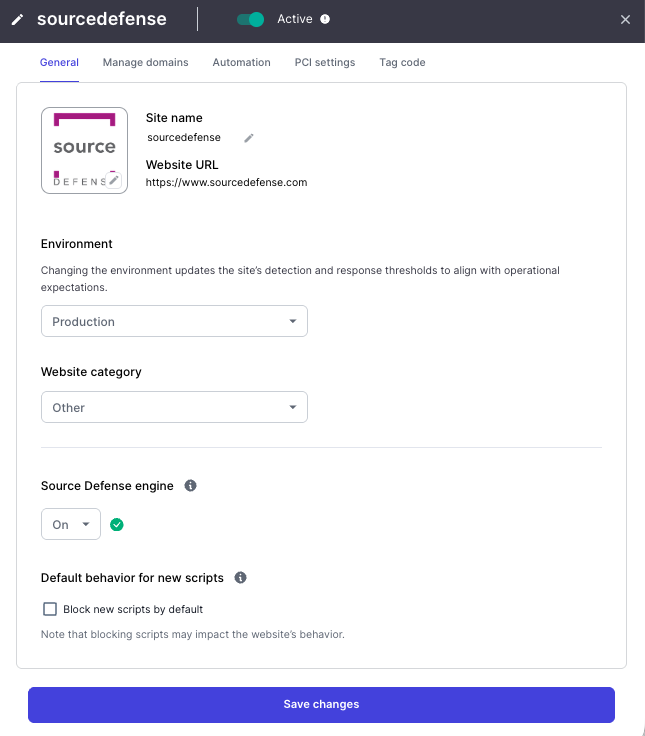 Select environment - to facilitate management via grouping capabilities, such as selecting “All production sites” from the drop-down in the top banner when on the Scripts list page. Furthermore, PCI alerts will only be triggered for production sites.