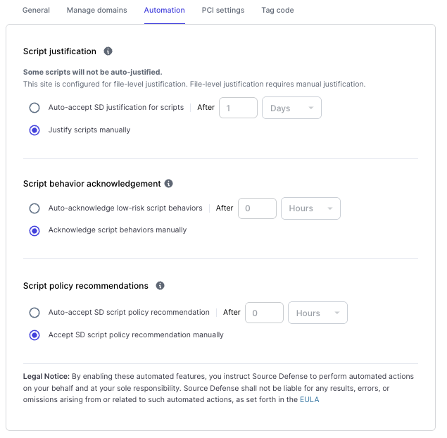 Automatically applies Source Defense’s recommended policies for detected scripts.
