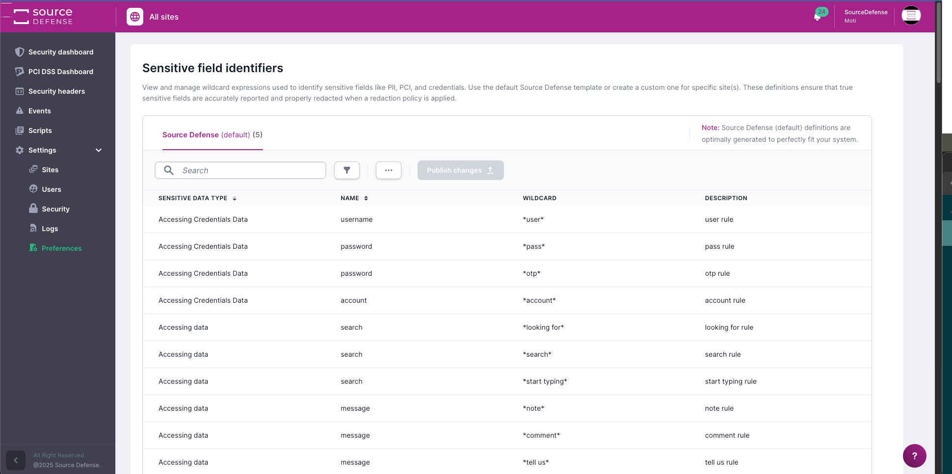 Script behaviors related to accessing sensitive data - PCI, PII and credential data - are identified based on common field identifiers.